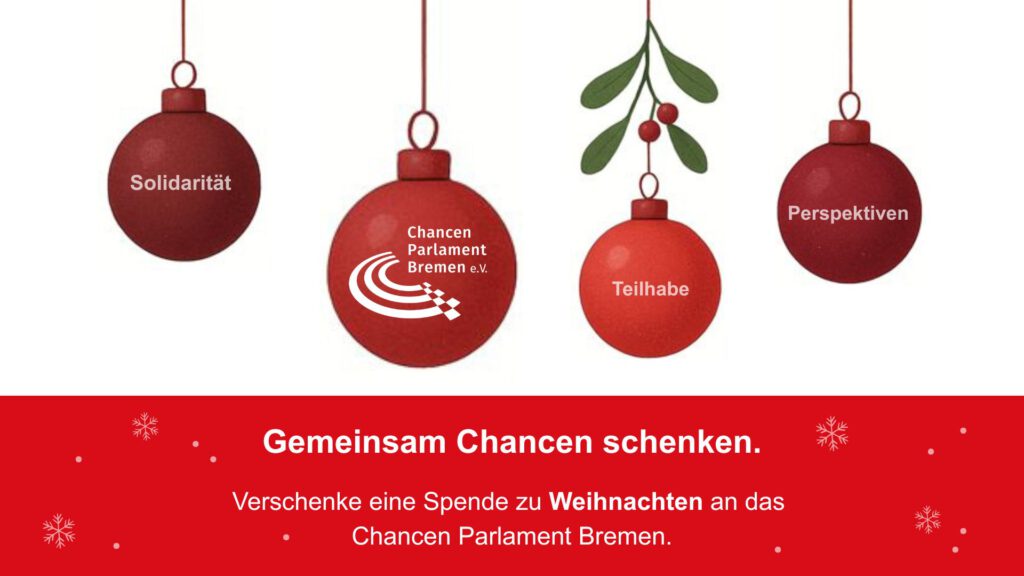 Das Ziel des Chancen-Parlaments Bremen e.V. ist es, von Armut betroffenen oder bedrohten Menschen Chancen und Perspektiven in unserer Gesellschaft zu eröffnen. Für den Verein steht der Mensch mit seinen Fähigkeiten und Potenzialen im Mittelpunkt. Der Verein will Menschen erreichen, die sich selbst aus ihrer prekären Lage befreien wollen, indem auf Augenhöhe gemeinsam Chancen eröffnet werden.